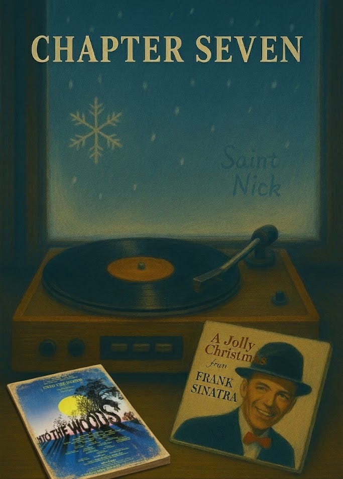 After a moment, he rises and walks to the old record player near the window. The wood is worn smooth from years of December hands lifting its lid. He slides out the record without looking, Frank Sinatra: A Jolly Christmas.